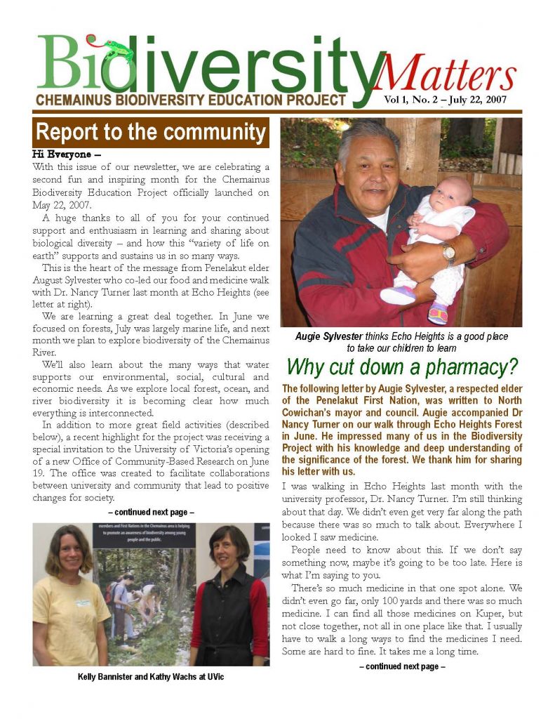 Chemainus Biodiversity Education Project “Biodiversity Matters” newsletter, which provides a summary of events and activities from the project’s first year of pilot activities. Published July 2007.