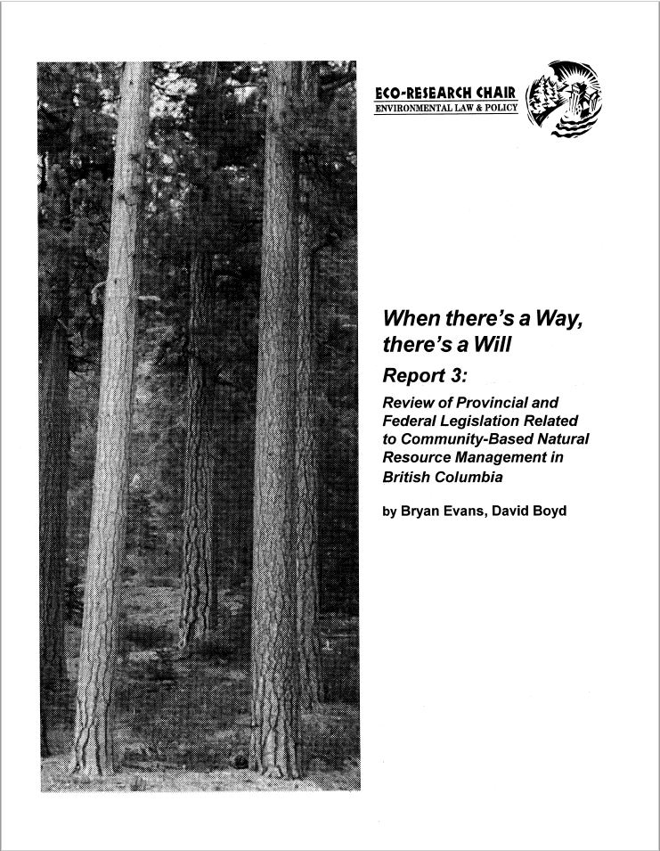 Full Citation: Evans, B., and Boyd, D. 2001. When There’s A Way, There’s a Will, Report 3: “Review of Provincial and Federal Legislation Related to Community-Based Natural Resource Management in British Columbia”. Victoria: Eco-Research Chair in Environmental Law and Policy, University of Victoria.